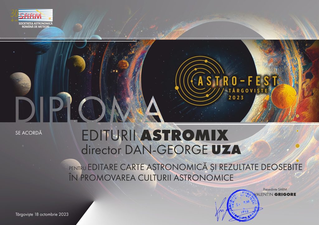 In luna octombrie 2023, Editura Astromix a lansat felicitarea unicat „SARM 30” pentru marele festival Târgoviște Astro-Fest 2023, unde a fost distinsă cu “Diploma pentru editare de carte astronomică și rezultate deosebite în promovarea culturii astronomice”. Le mulțumim prietenilor noștri de la Societatea Astronomică Română de Meteori – SARM pentru această distincție și le urăm cer senin cu ocazia împlinirii a 30 de ani de activitate!